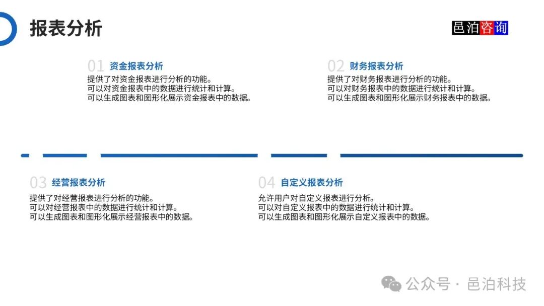 报表分析包括:资金报表分析、财务报表分析、经营报表分析、自定义报表分析。