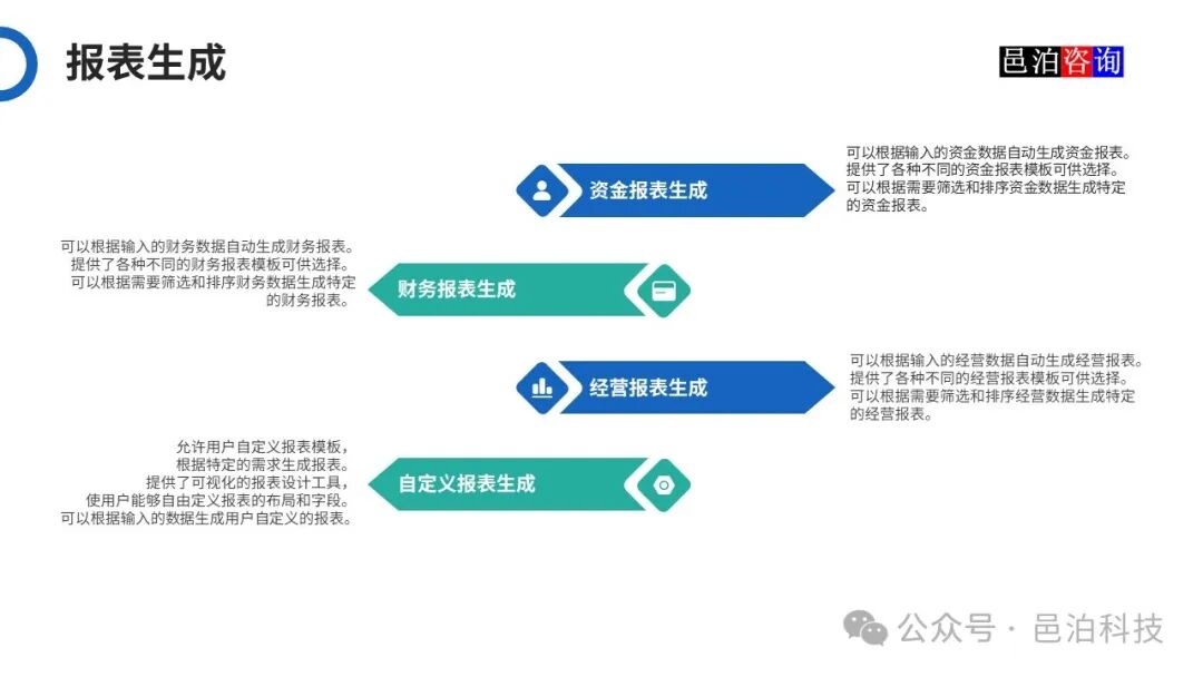 报表生成包括:资金报表生成、财务报表生成、经营报表生成和自定义报表生成。