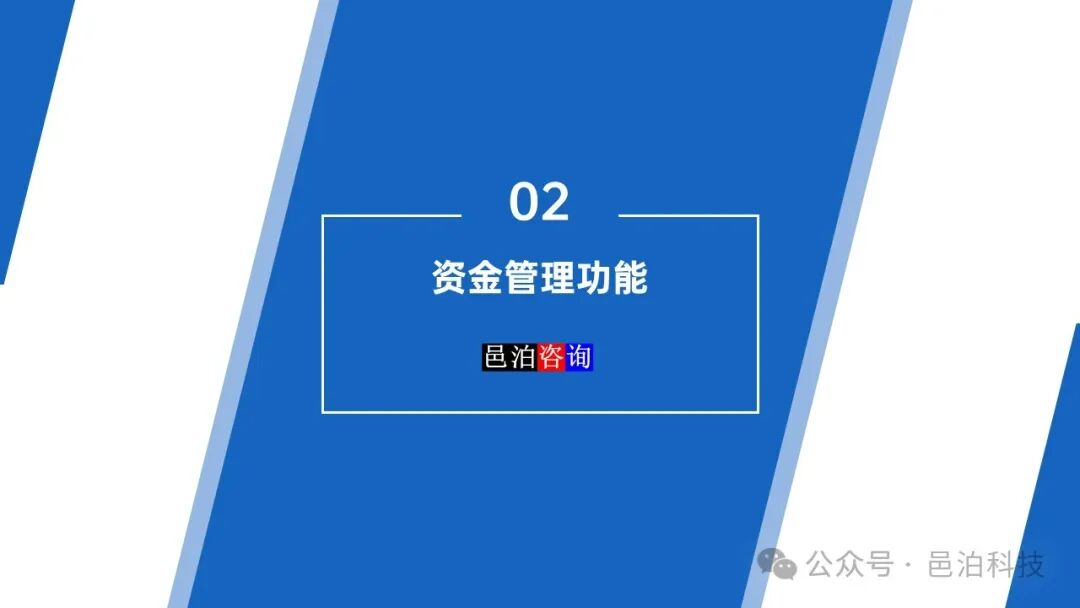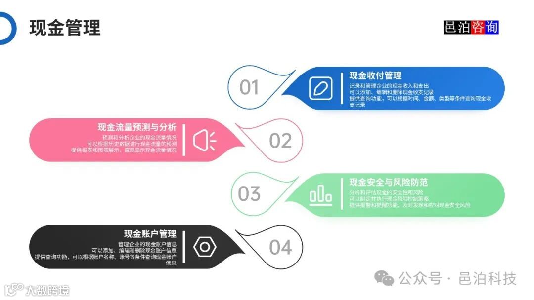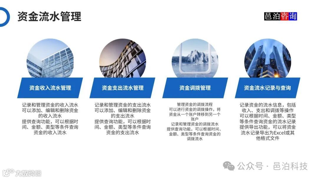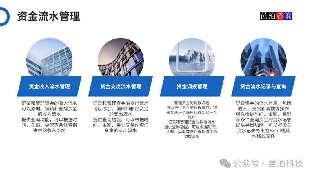 主要包括:资金流水管理、银行账户管理、预算管理和现金管理。