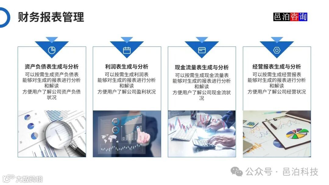 财务报表管理包括:资产负债表生成与分析、利润表生成与分析、现金流量表生成与分析、经营报表生成与分析。