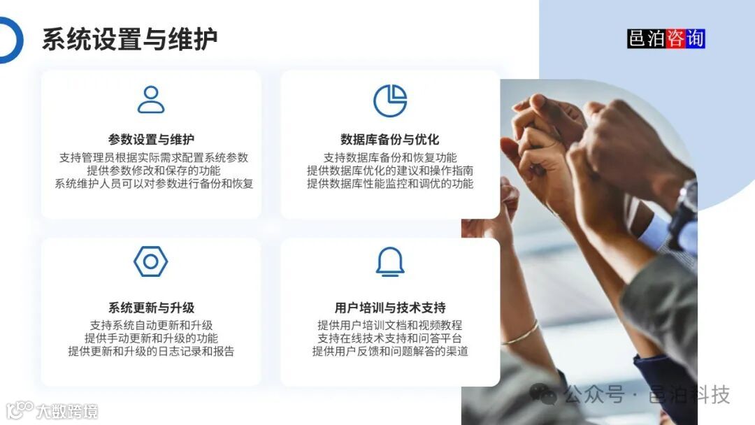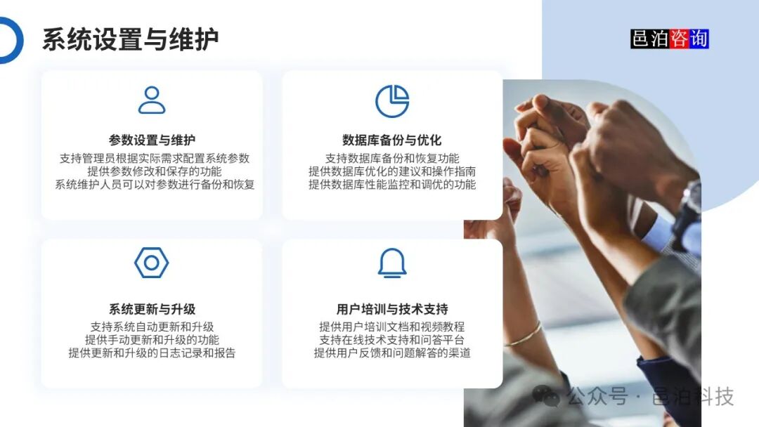 系统设置与维护包括:参数设置与维护、数据库备份与优化、系统更新与升级、用户培训与技术支持。