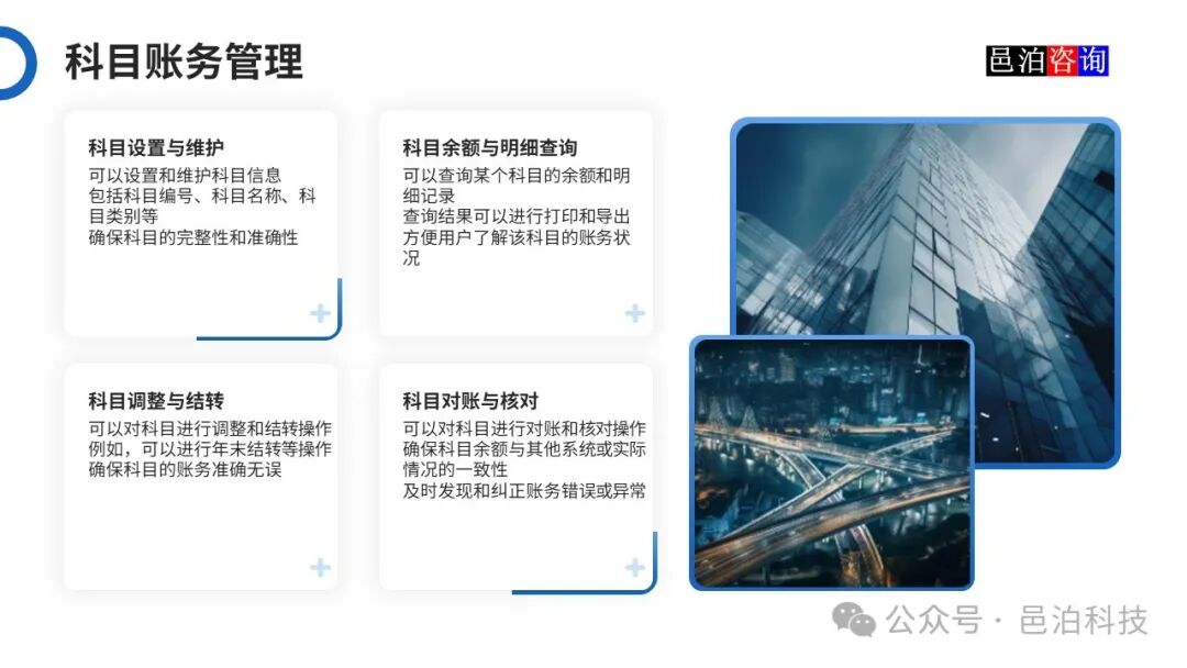 科目账务管理包括:科目设置与维护、科目余额与明细查询、科目调整与结转、科目对账与核对。