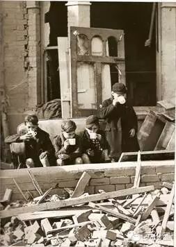 二战中遭遇轰炸的英国,几个男孩在废墟中仍然端着茶杯,享受一杯茶的悠闲