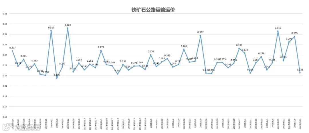 本周铁矿石运输运价为0.235元/吨公里,较上周下跌了0.01元/吨公里,跌幅为12.95%。
