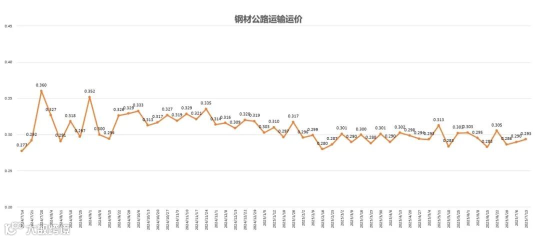 本周钢材运输运价为0.293元/吨公里,较上周上涨了0.003元/吨公里,涨幅为1.03%。