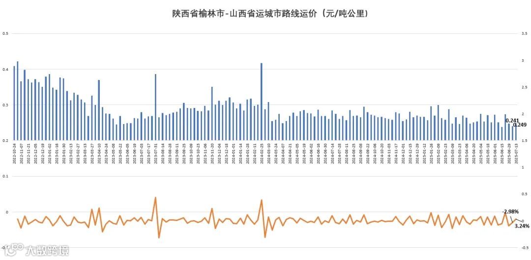 本周榆林至运城干线周平均价为113.67元/吨,按公里数折算为0.249元/吨公里,上涨3.24%。
