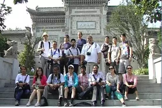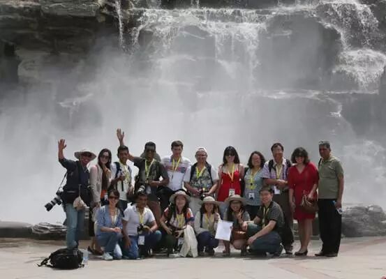 2014年亚媒记者在大唐芙蓉园内的瀑布前合影
