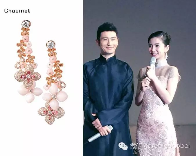 Baby第二身是闪闪的旗袍。来头也不小,是做《花样年华》里那些美旗袍的张叔平做的。Baby搭配了Chaumet的绣球花耳环。