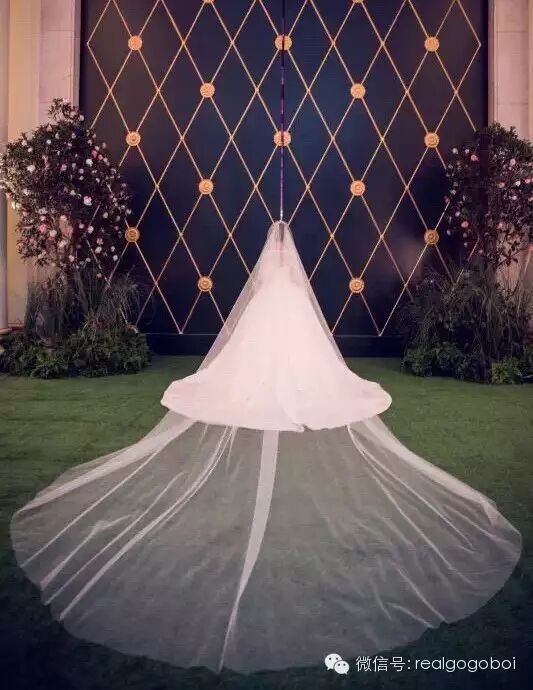 裙摆拖尾可能有点谦虚,所以头纱得镇住全场,头纱长达4.5米。