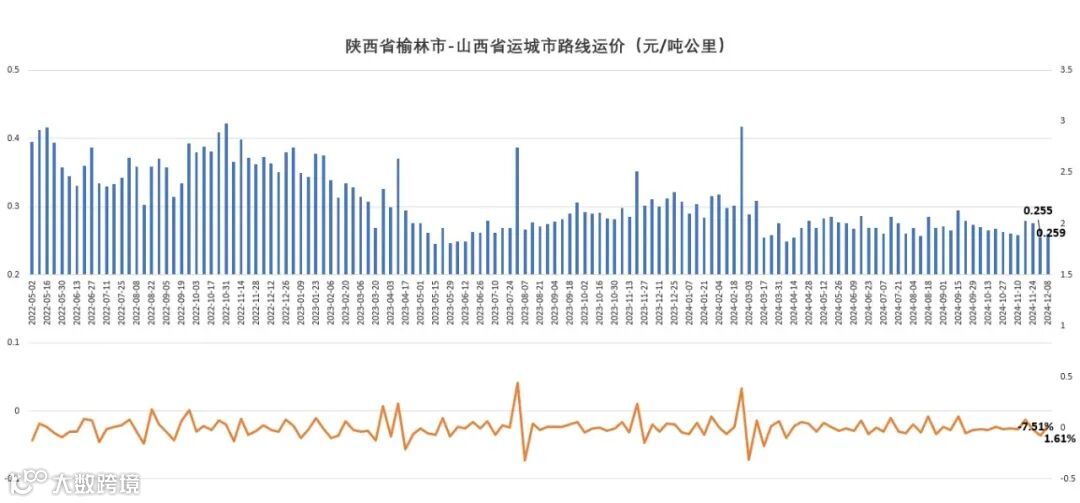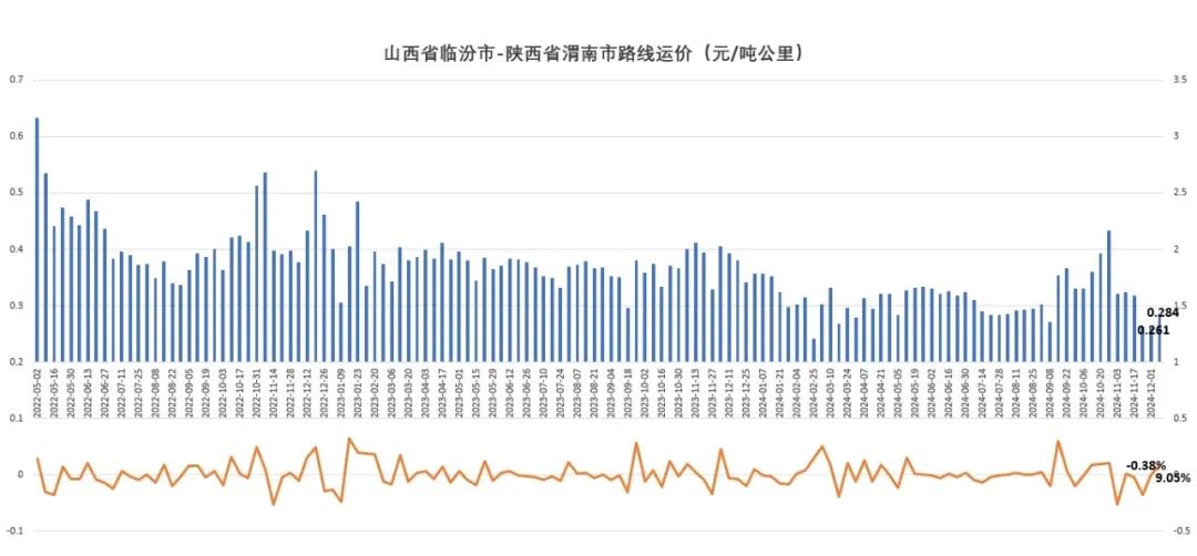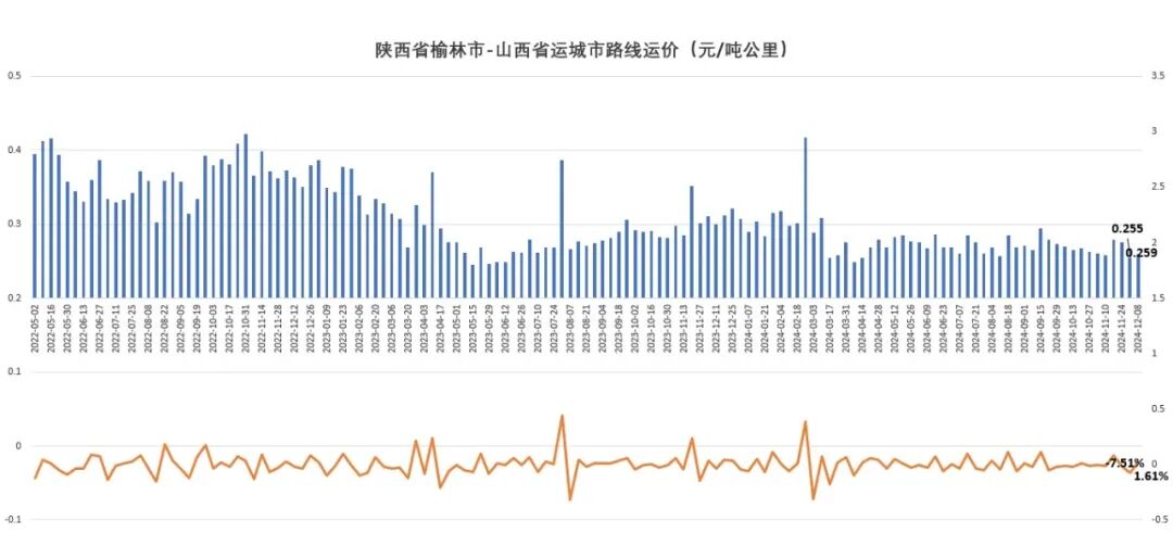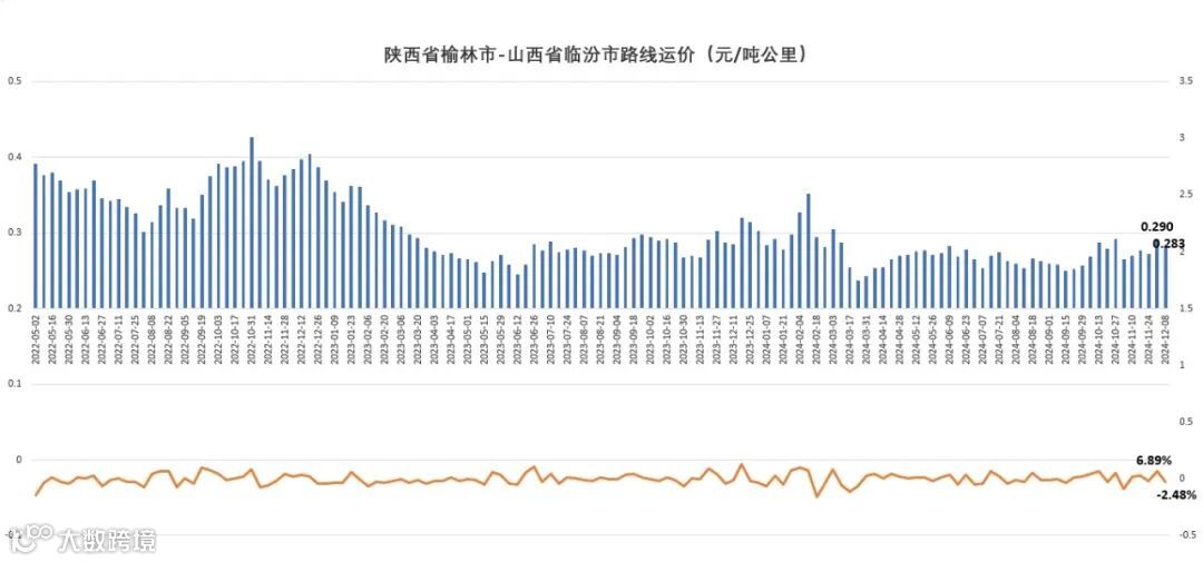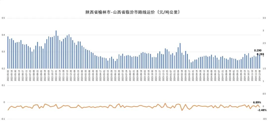 本周榆林至运城干线周平均价为126.59元/吨,按公里数折算为0.259元/吨公里,上涨1.61%。