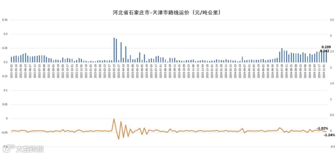 本周石家庄至天津干线周平均价为60.69元/吨,按公里数折算为0.239元/吨公里,下跌1.24%。