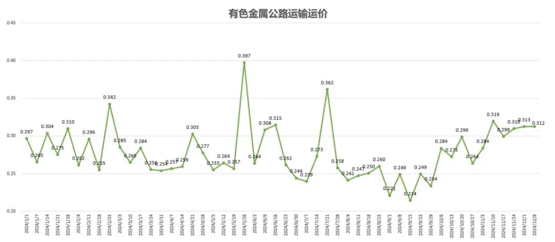 本周有色金属运输运价为0.312元/吨公里,较上周下跌了0.001元/吨公里,跌幅为0.32% 。