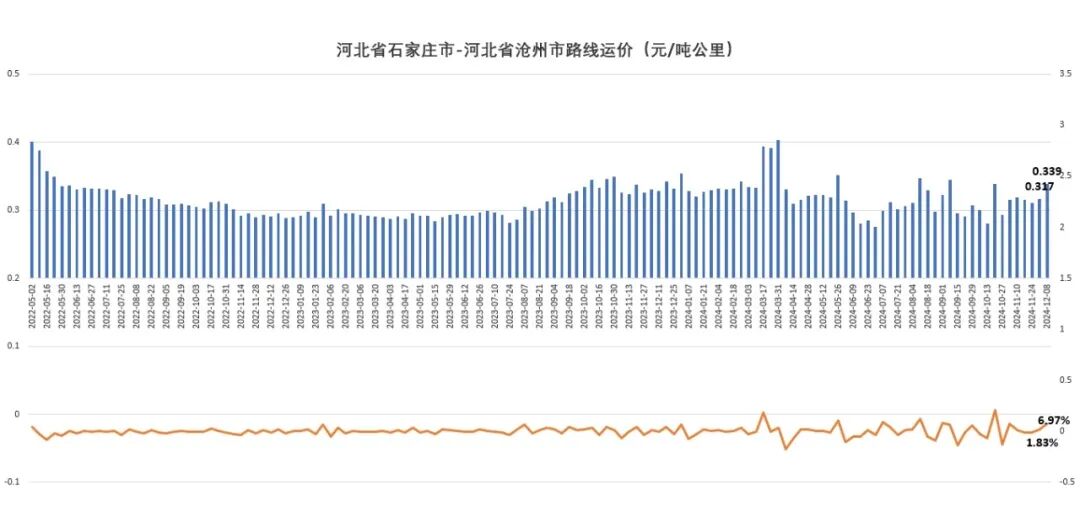 本周石家庄至沧州干线周平均价为46.31元/吨,按公里数折算为0.339元/吨公里,上涨6.97%。