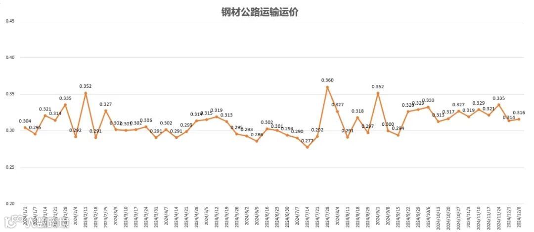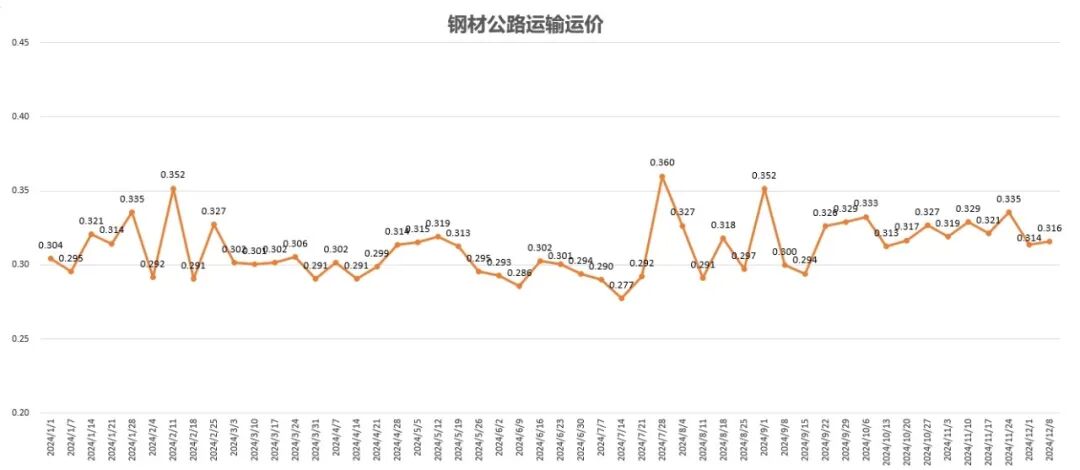 本周钢材运输运价为0.316元/吨公里,较上周上涨了0.002元/吨公里,涨幅为0.64%。