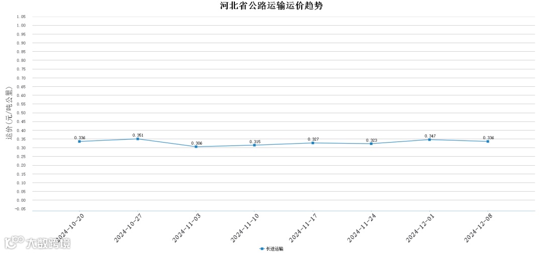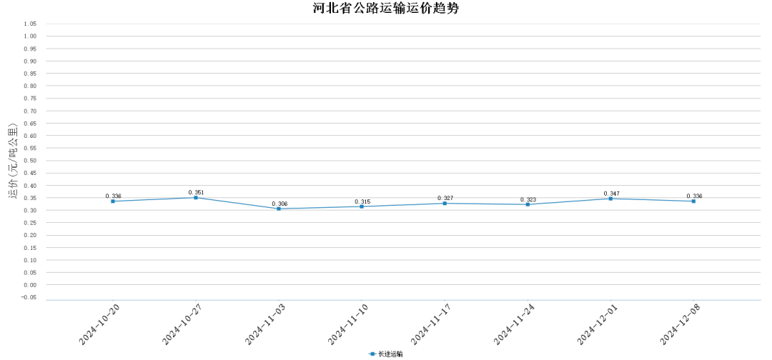 本周河北公路运输运价为0.336元/吨公里,较上周下跌了0.011元/吨公里,跌幅为3.17%。