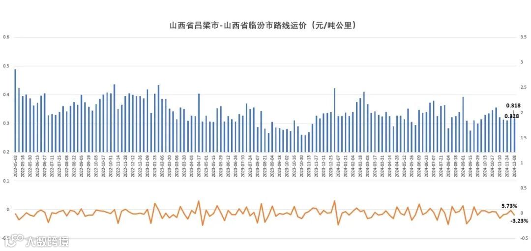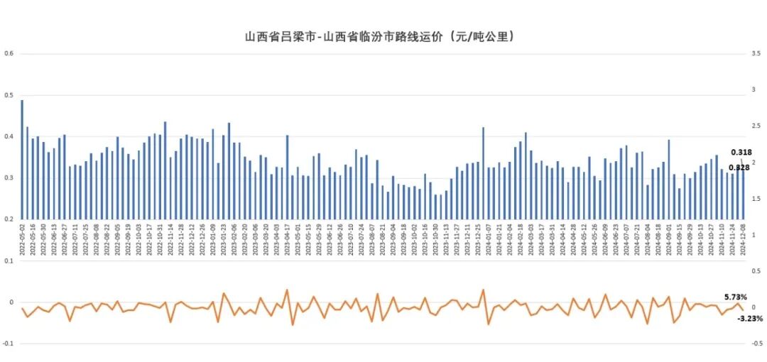 本周吕梁至临汾干线周平均价为78.37元/吨,按公里数折算为0.318元/吨公里,下跌3.23%。