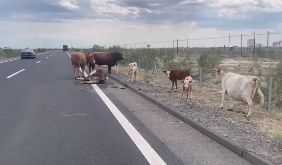 民警赶到现场时,看到一辆货车停在应急车道上,车头右侧的保险杠都撞裂了。路边躺着一头已经死去的牛,而不远处,6头牛还在高速路上“闲逛”。