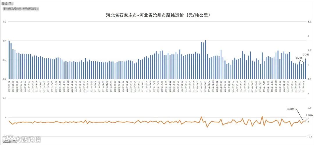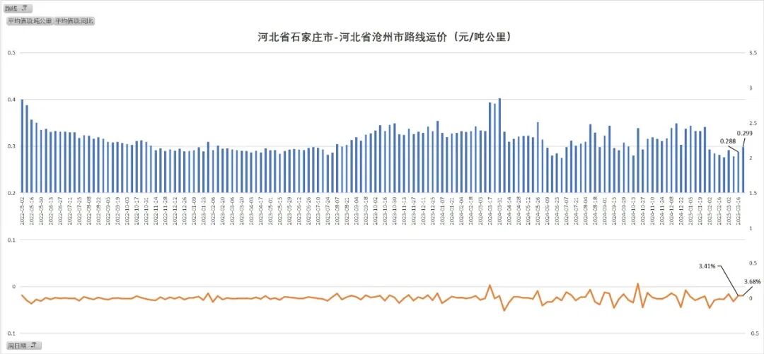本周石家庄至沧州干线周平均价为64.51元/吨,按公里数折算为0.299元/吨公里,上涨3.68%。