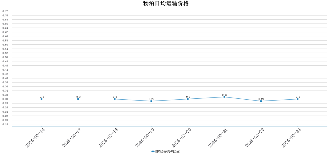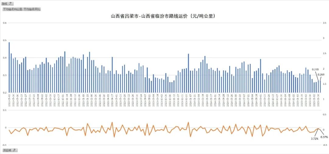 本周吕梁至临汾干线周平均价为60.54元/吨,按公里数折算为0.269元/吨公里,下跌0.37%。
