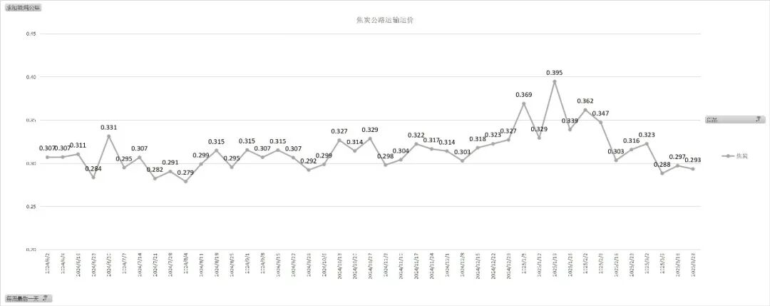 本周焦炭运输运价为0.293元/吨公里,较上周下跌了0.004元/吨公里,跌幅为1.35% 。