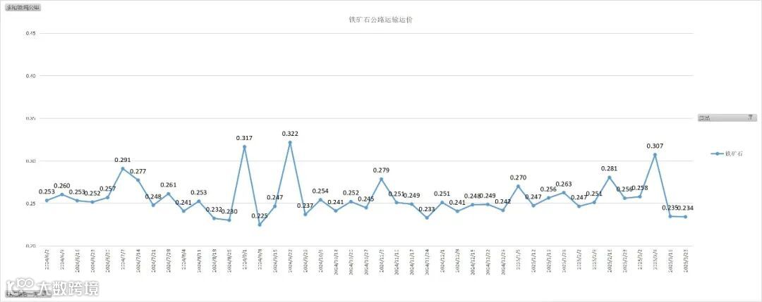 本周铁矿石运输运价为0.234元/吨公里,较上周下跌了0.001元/吨公里,跌幅为0.43%。