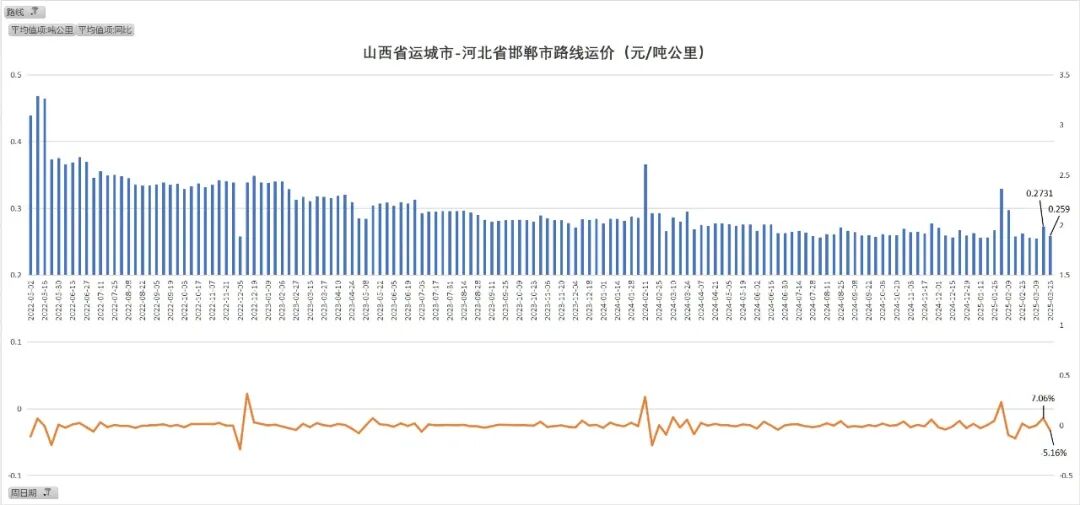 本周运城至邯郸干线周平均价为105.53元/吨,按公里数折算为0.259元/吨公里,下跌5.16%。