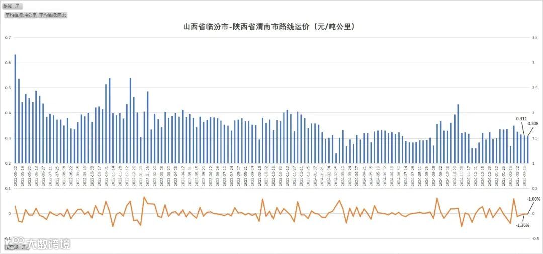 本周临汾至渭南干线周平均价为51.23元/吨,按公里数折算为0.308元/吨公里,下跌1.00%。