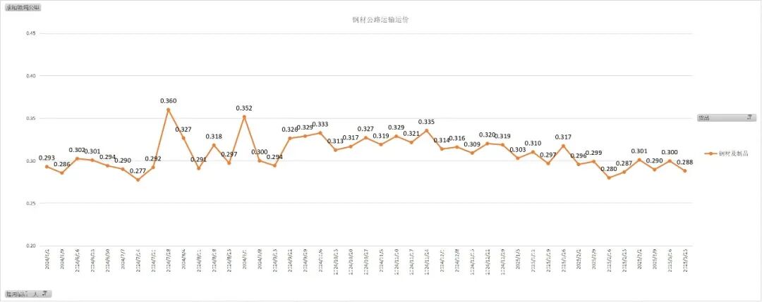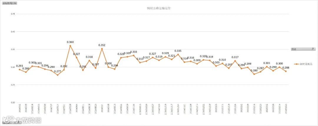 本周钢材运输运价为0.288元/吨公里,较上周下跌了0.012元/吨公里,跌幅为4%。