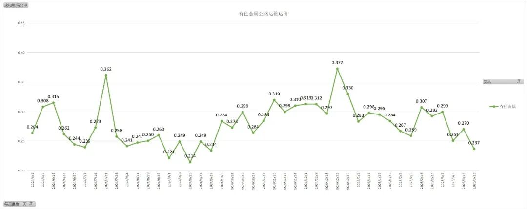 本周有色金属运输运价为0.237元/吨公里,较上周下跌了0.033元/吨公里,跌幅为12.22% 。