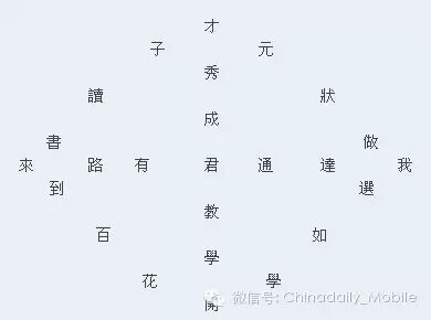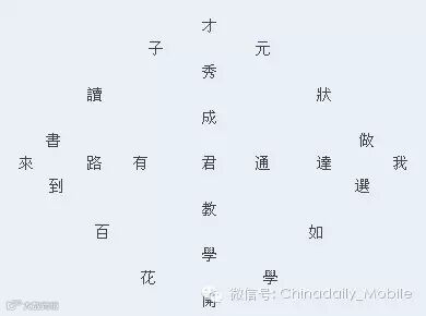 读法:先按十字形读成一首七言绝句,再读外圈,运用顶针,可读成一首五言绝句。