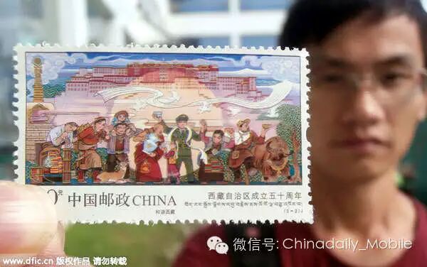 A Chinese stamp collector shows a stamp issued to mark the 50th anniversary for the establishment of Tibet autonomous region at a China Post Office in Suzhou city, East China's Jiangsu province. [Photo/IC]