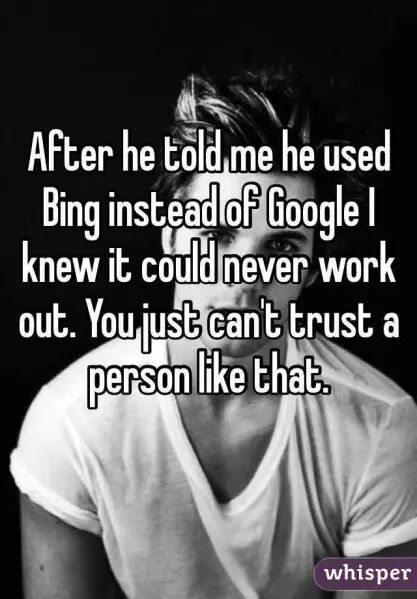 他跟我说他用的是必应而不是谷歌,我就觉得我们不能在一起了。你根本不能信任一个用必应的人啊。