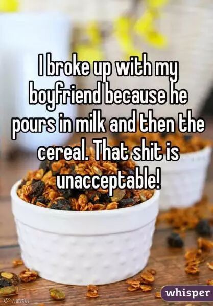 10. I broke up with my boyfriend because he pours in milk and then the cereal. That s**t is unacceptable!