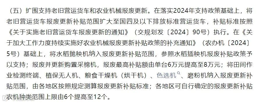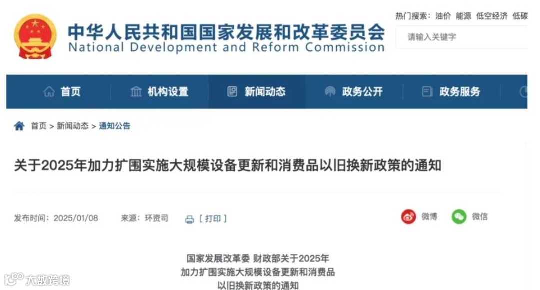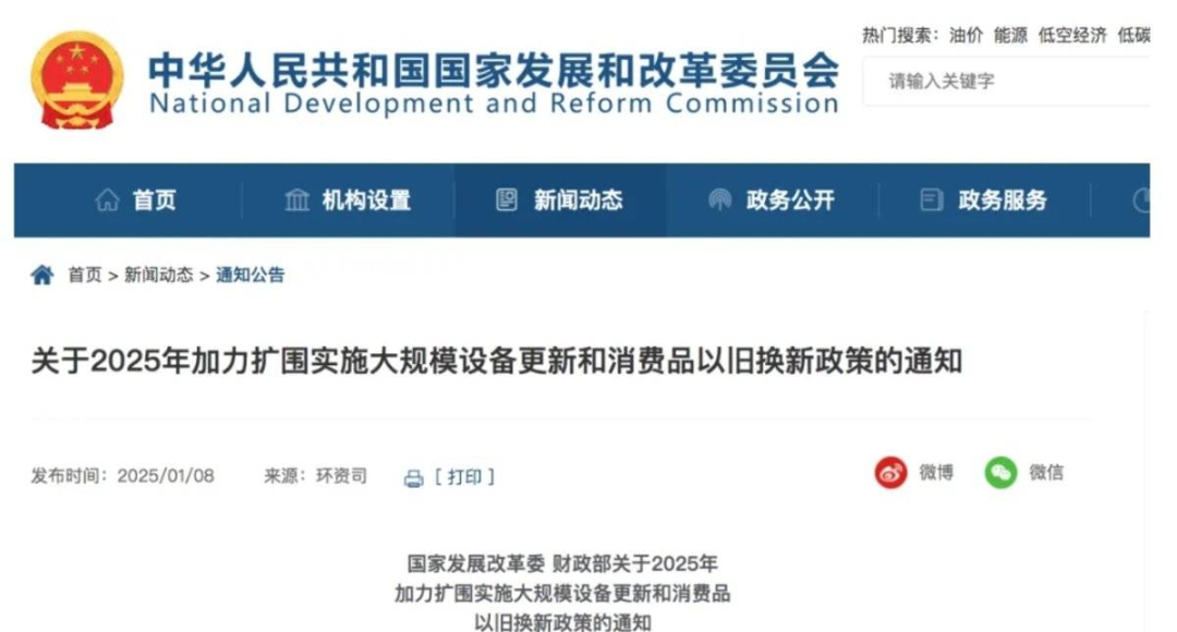 1月8日,国家发展改革委、财政部发布2025年加力扩围实施大规模设备更新和消费品以旧换新政策的通知。