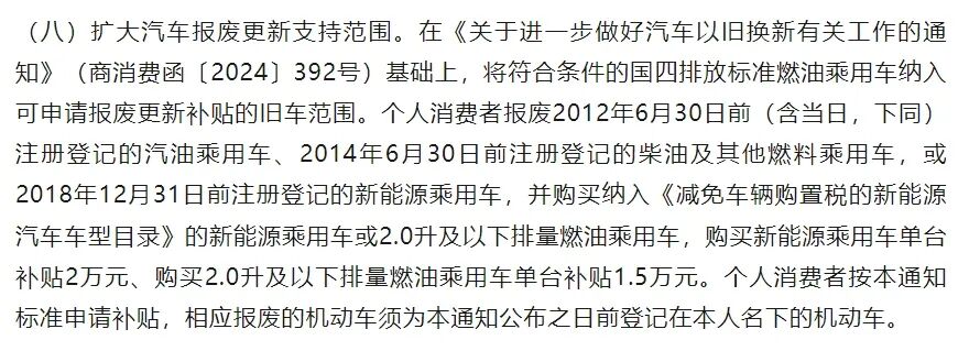 在《关于进一步做好汽车以旧换新有关工作的通知》(商消费函〔2024〕392号)基础上,将符合条件的国四排放标准燃油乘用车纳入可申请报废更新补贴的旧车范围。