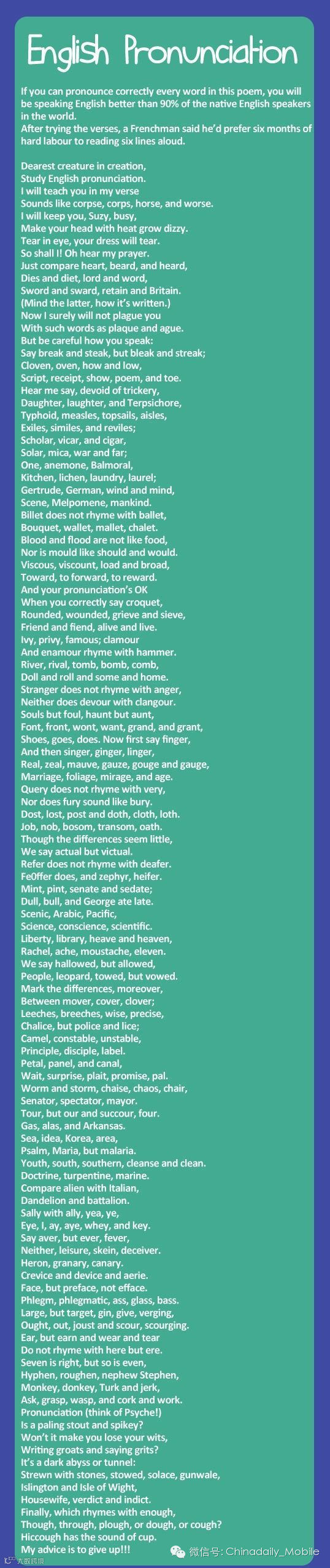 据说这是一个很神奇的音频,号称可以“搞定全部英语发音”!如果你能把这首英文诗歌的每一个单词都读对,你的英文发音就会超越90%的native speaker了。