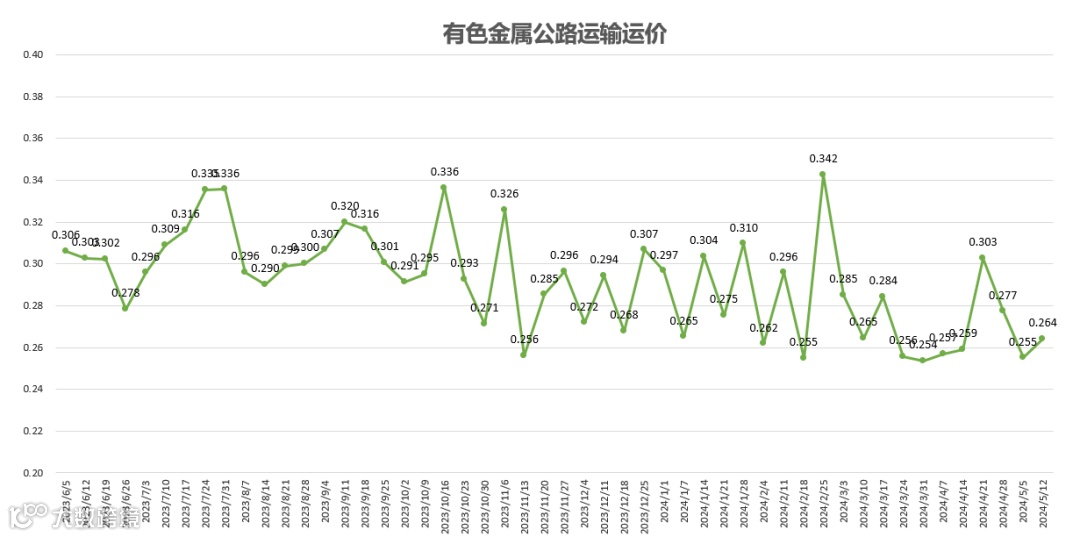 本周有色金属运输运价为0.264元/吨公里,较上周上涨了0.009元/吨公里,涨幅为3.53% 。
