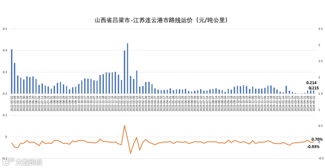 本周吕梁至连云港干线周平均价为192.96元/吨,按公里数折算为0.215元/吨公里,上涨0.70%。