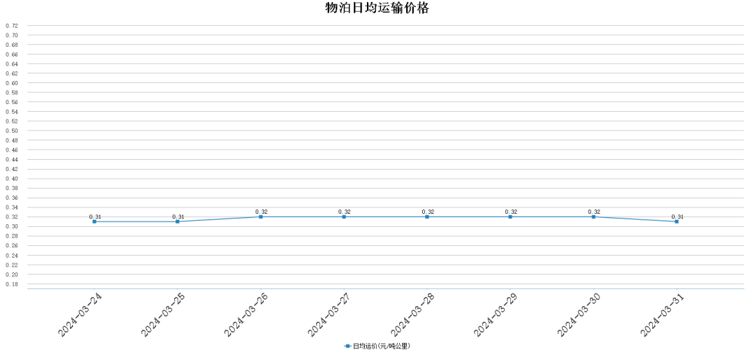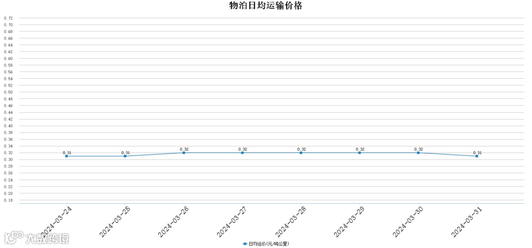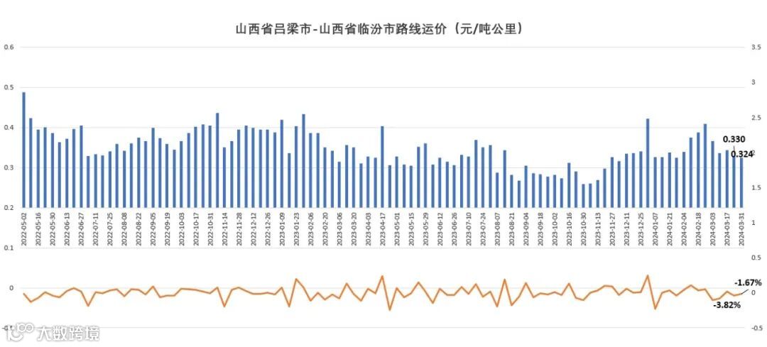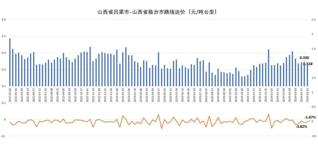 本周吕梁至临汾干线周平均价为70.72元/吨,按公里数折算为0.324元/吨公里,下跌1.67%。