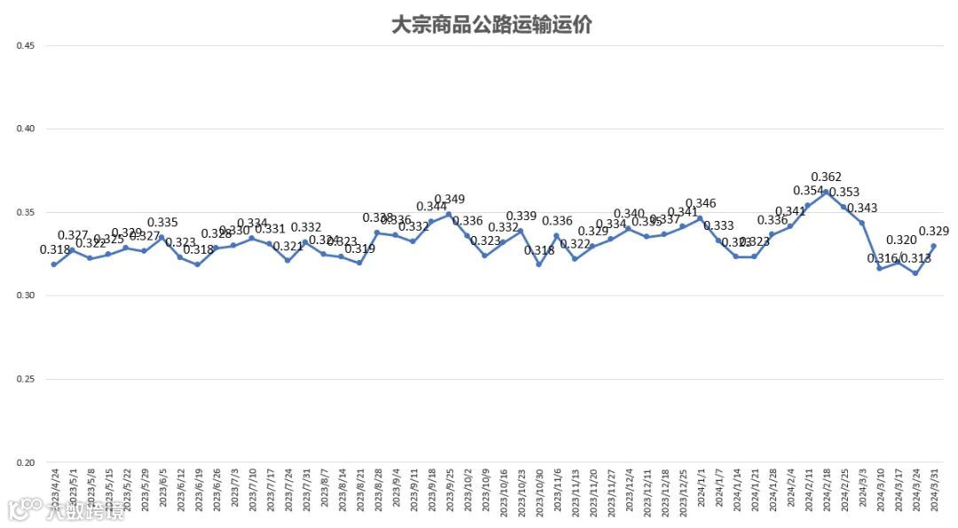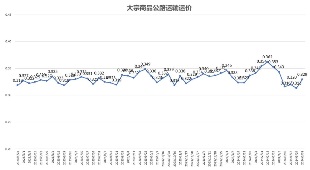 本周大宗商品公路运输运价为0.329元/吨公里,上涨5.11%。
