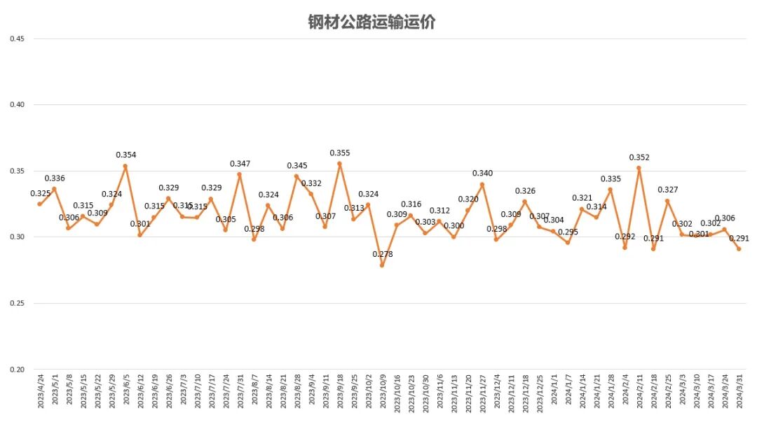 本周钢材运输运价为0.291/吨公里,较上周下跌了0.015元/吨公里,跌幅为4.90%。
