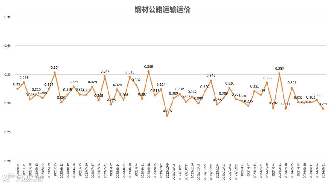 本周钢材价格下跌。供应方面,钢价再度下跌,钢厂处于盈亏边缘,生产积极性降低。需求方面,房地产市场持续下行,基础设施建设强度放缓,行情再次转弱导致终端需求释放力度不及预期,贸易商补库意愿不足,公路运输需求放缓。故本周钢材运输运价下跌。