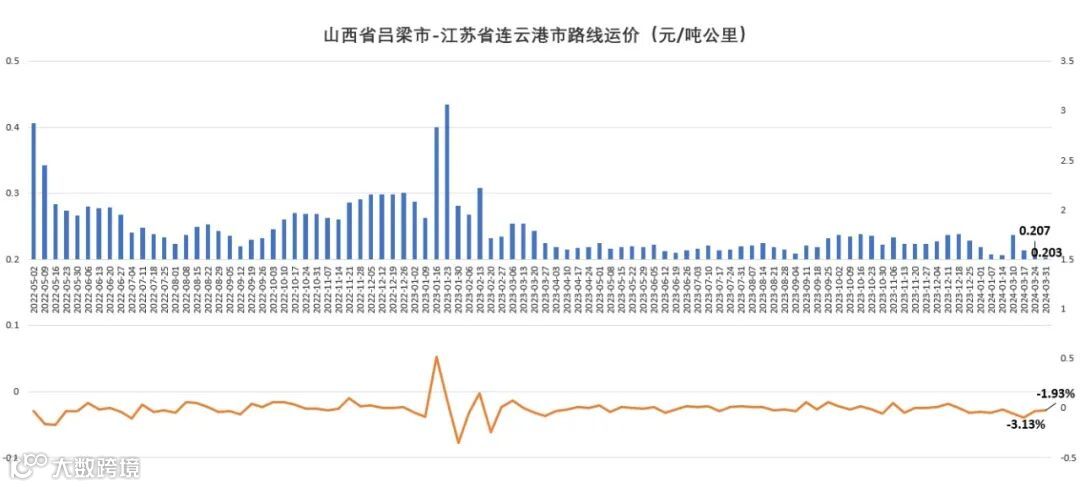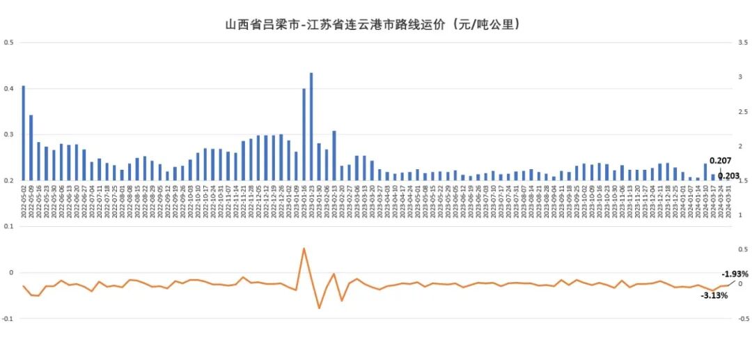 本周吕梁至连云港干线周平均价为182.38元/吨,按公里数折算为0.203元/吨公里,下跌1.93%。
