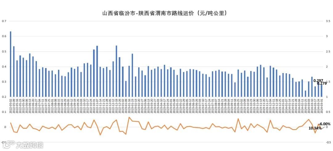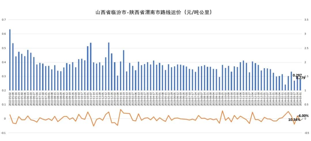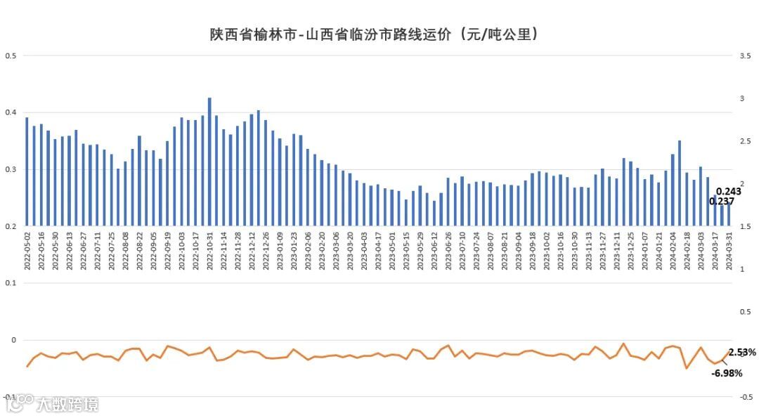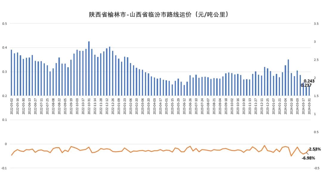 本周榆林至临汾干线周平均价为108.56元/吨,按公里数折算为0.243元/吨公里,上涨2.53%。