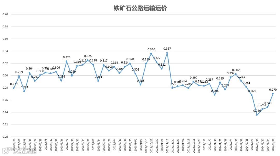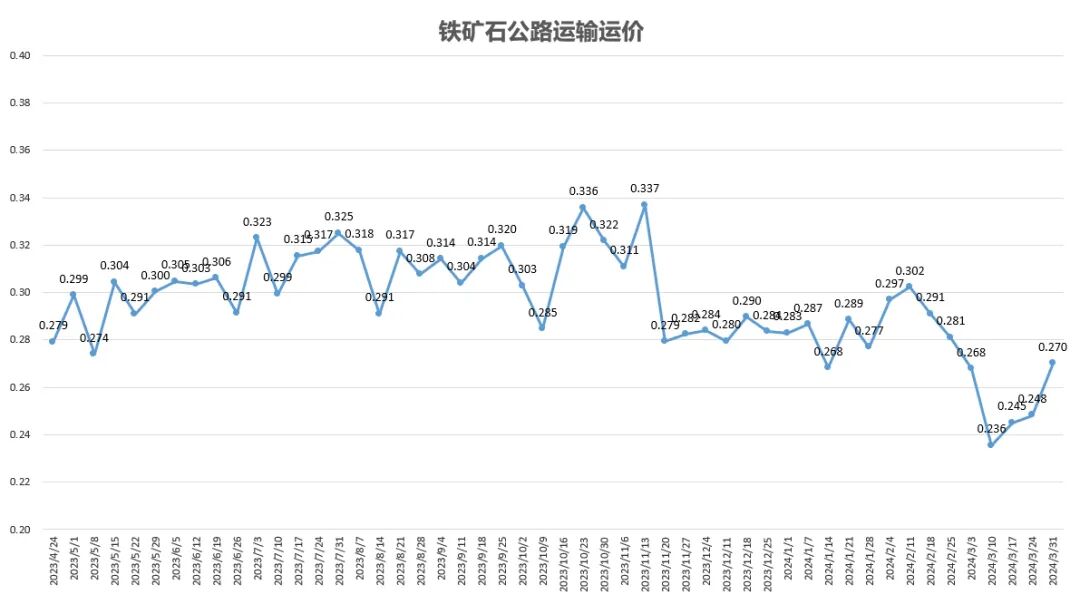 本周铁矿石价格下跌。供应方面,季节性扰动因素逐步解除,澳矿发运回升,巴西及非主流资源发运维稳。需求方面,当前市场悲观情绪有所修复,铁水产量止跌小幅回升,钢厂对铁矿石补库积极性小幅回暖,用车需求提升。故本周铁矿石运输运价上涨。
