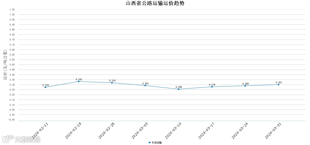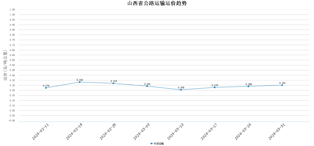本周山西公路运输运价为0.301元/吨公里,较上周上涨0.012元/吨公里,涨幅为4.15%。