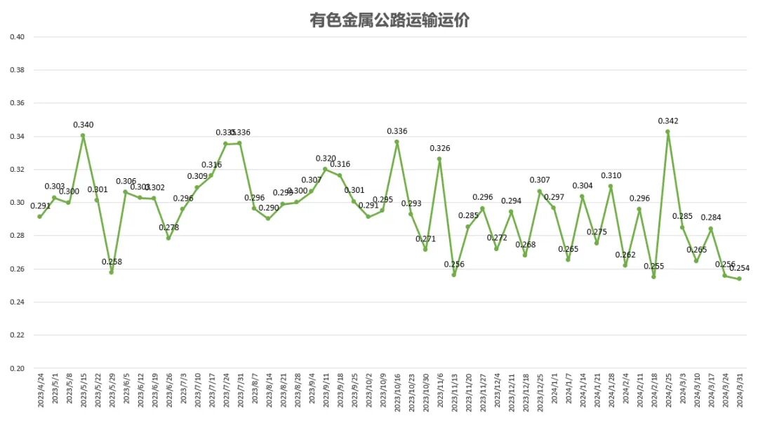 本周有色金属运输运价为0.254元/吨公里,较上周下跌了0.002元/吨公里,跌幅为0.78% 。