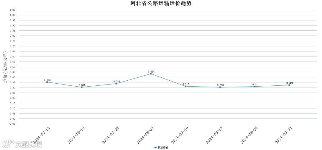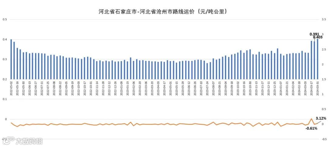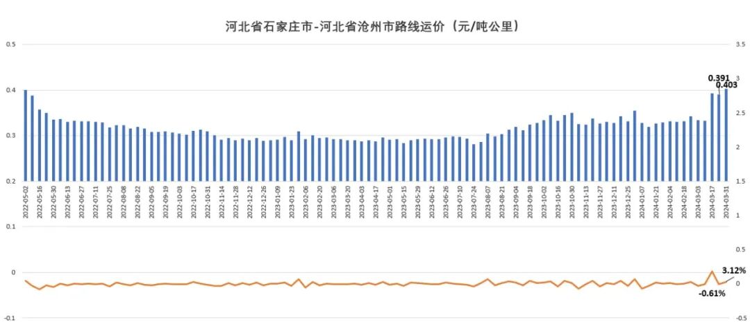 本周石家庄至沧州干线周平均价为47元/吨,按公里数折算为0.403/吨公里,上涨3.12%。