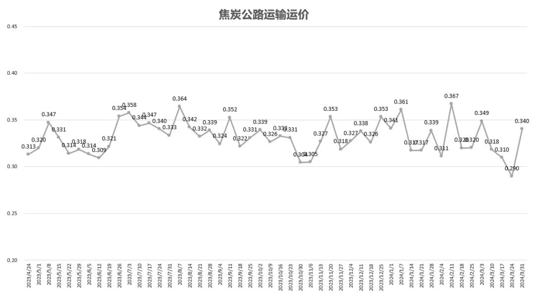 本周焦炭运输运价为0.340元/吨公里,较上周上涨了0.05元/吨公里,涨幅为17.24% 。