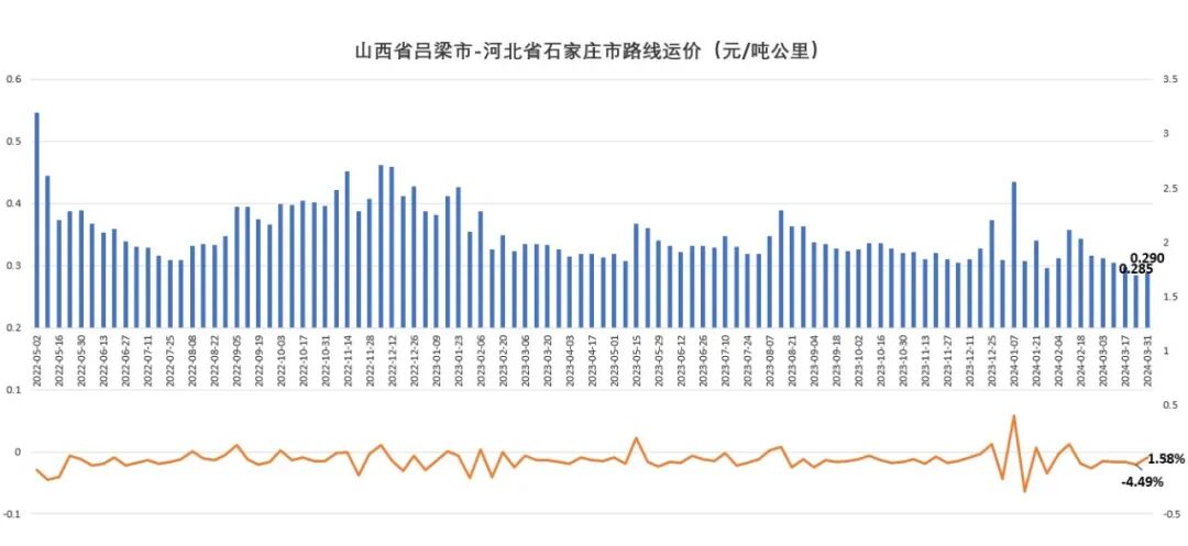 本周吕梁至石家庄干线周平均价为104.59元/吨,按公里数折算为0.290元/吨公里,上涨1.58%。